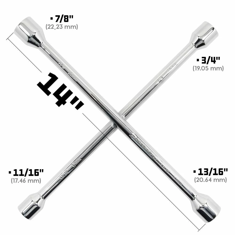 When you need a lug wrench it must be reliable. Few tools can match the strength, speed, and versatility of a Powerbuilt 4-way lug wrench. This heavy-duty 14-inch lug wrench performs great and looks good too with its high chrome finish that helps resist corrosion. Universal design means it fits both SAE and metric lug nuts covering most vehicles. Precision-built and affordable, Powerbuilt products meet or exceed ANSI standards.