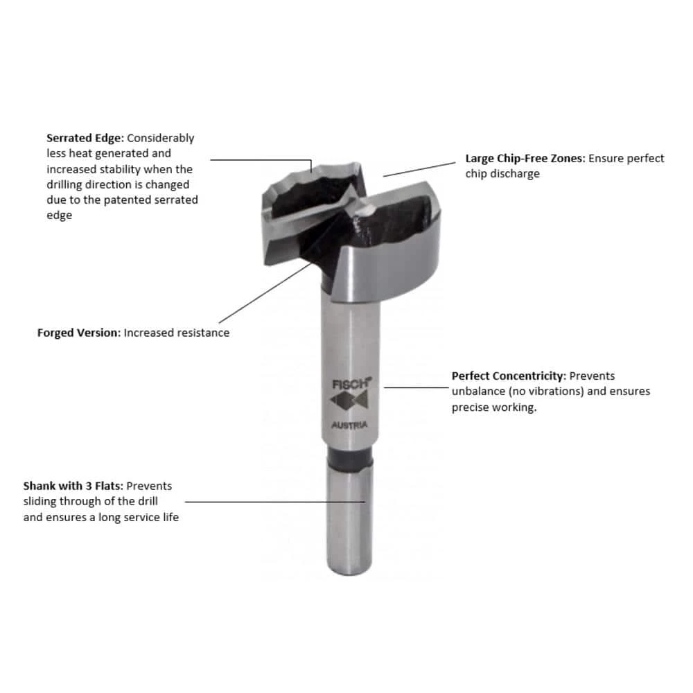 The Fisch Wave Cutter is a high performance, next generation Forstner Bit and is truly the world’s best. Designed with the patented wave cutter, this Forstner bit has been tested against other leading bits and has been and proven to drill 3 times the number of holes before needing to be re-sharpened. Manufactured from Forged and Heat Treated Steel, its unique non-clogging design allows you to drill precise holes quickly without burning, while helping to increase the overall life of the bit. Drills smooth and precise holes in soft woods, hard woods and laminates with 25% less power required. Designed for the professional trade and can be used in portable power drills and stationary boring machines.